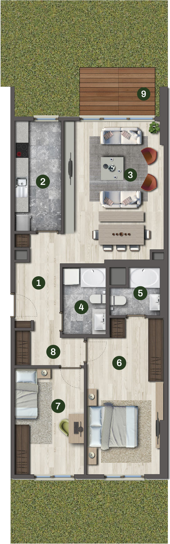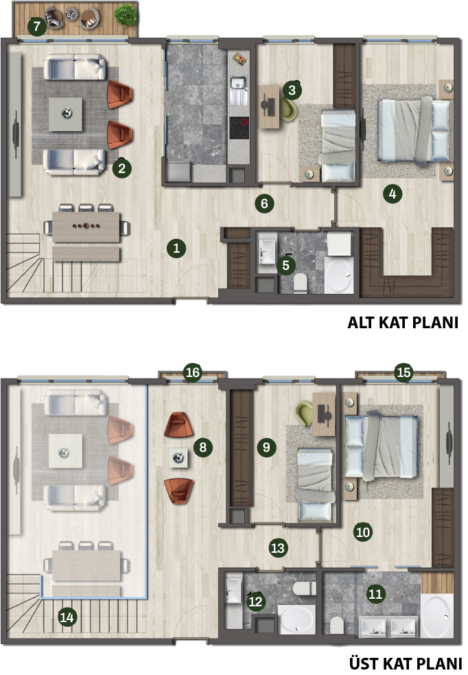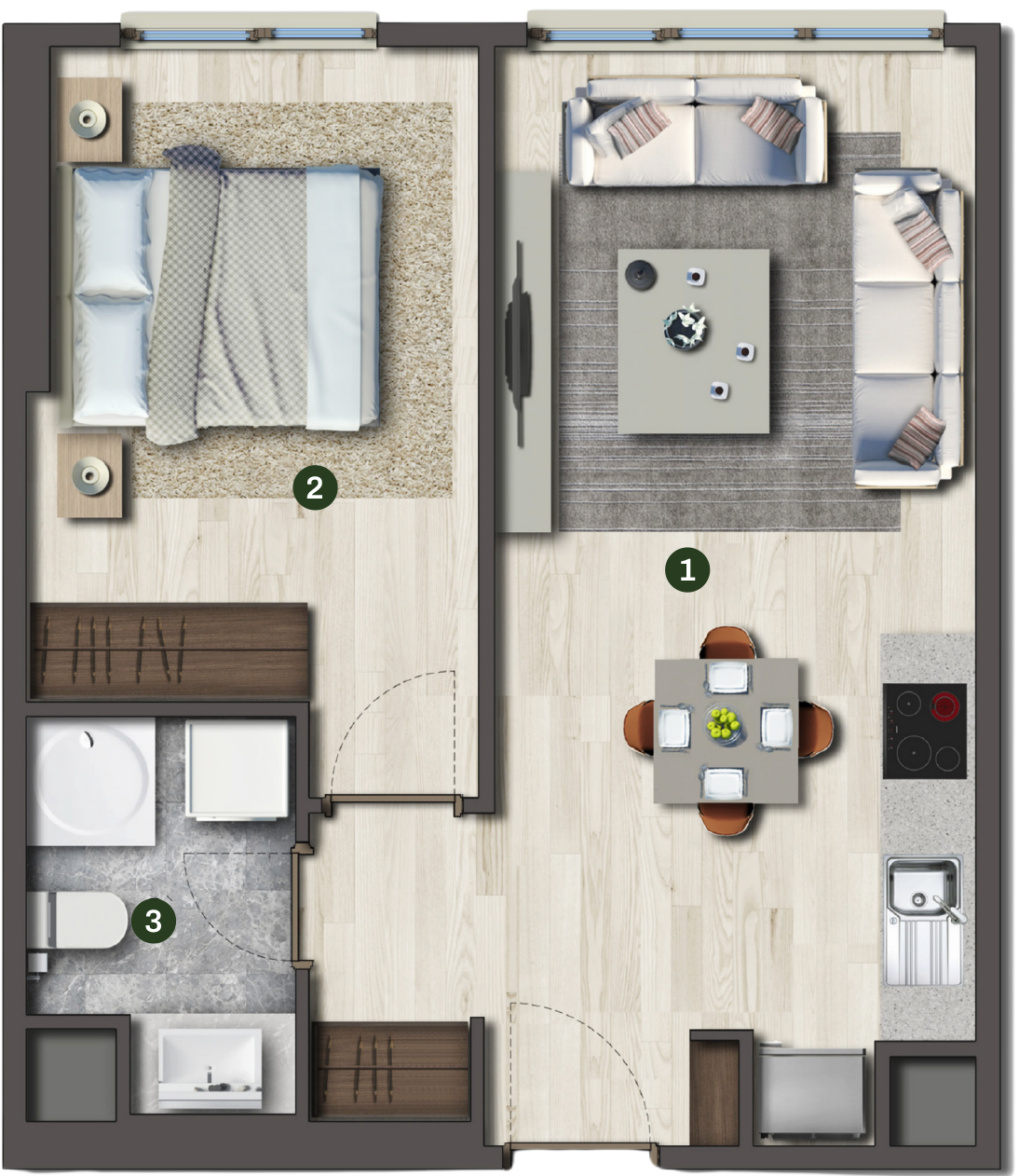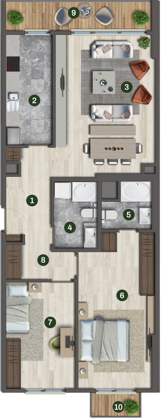 Yatay mimariyle planlanan daireler, ferahlık ve kullanım kolaylığını bir araya getiriyor.