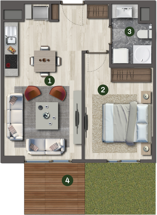 Projede 1+1’den 4+1 dublekse kadar farklı ihtiyaçlara uygun geniş ve fonksiyonel daire tipleri bulunmaktadır. Bahçe katı ve teraslı seçenekler de sunulmaktadır.