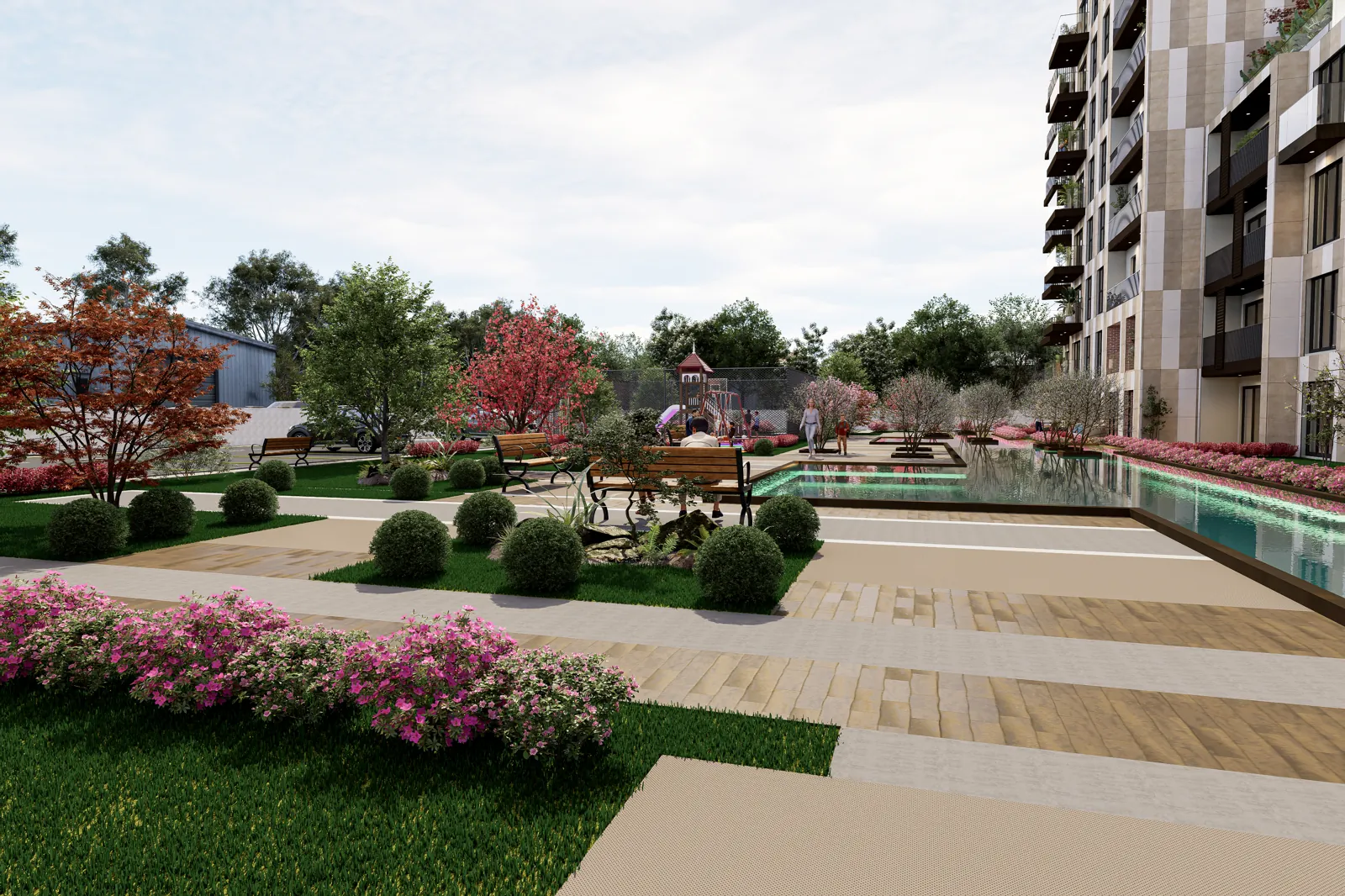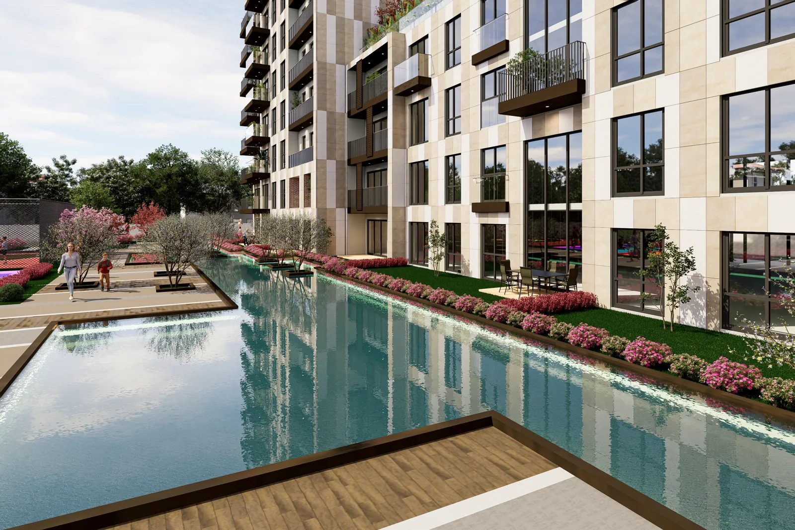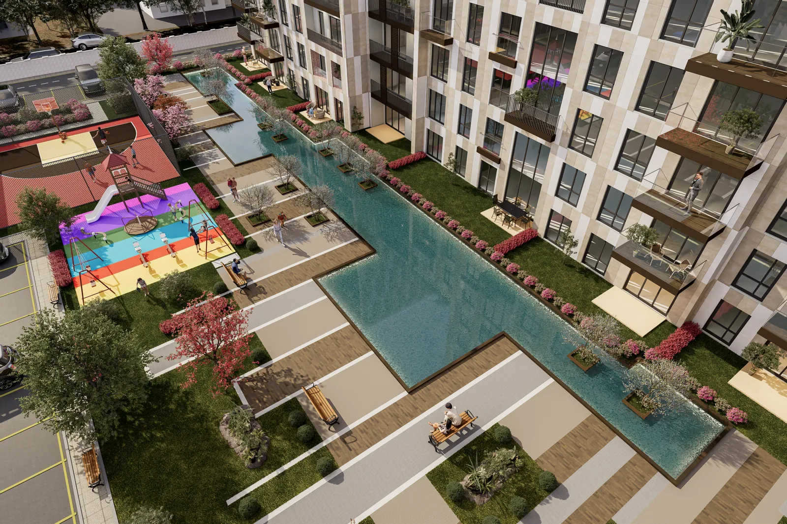 Havuz, estetik tasarımı ve çevresindeki yeşil alanlarla projeye ferah bir görünüm kazandırıyor. Sakinlerin gün içinde huzur bulabileceği, sosyal yaşam alanlarını tamamlayan dingin bir atmosfer sunuyor.