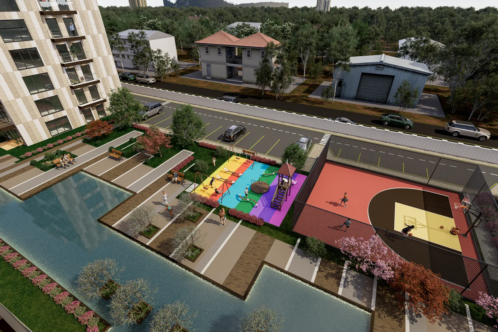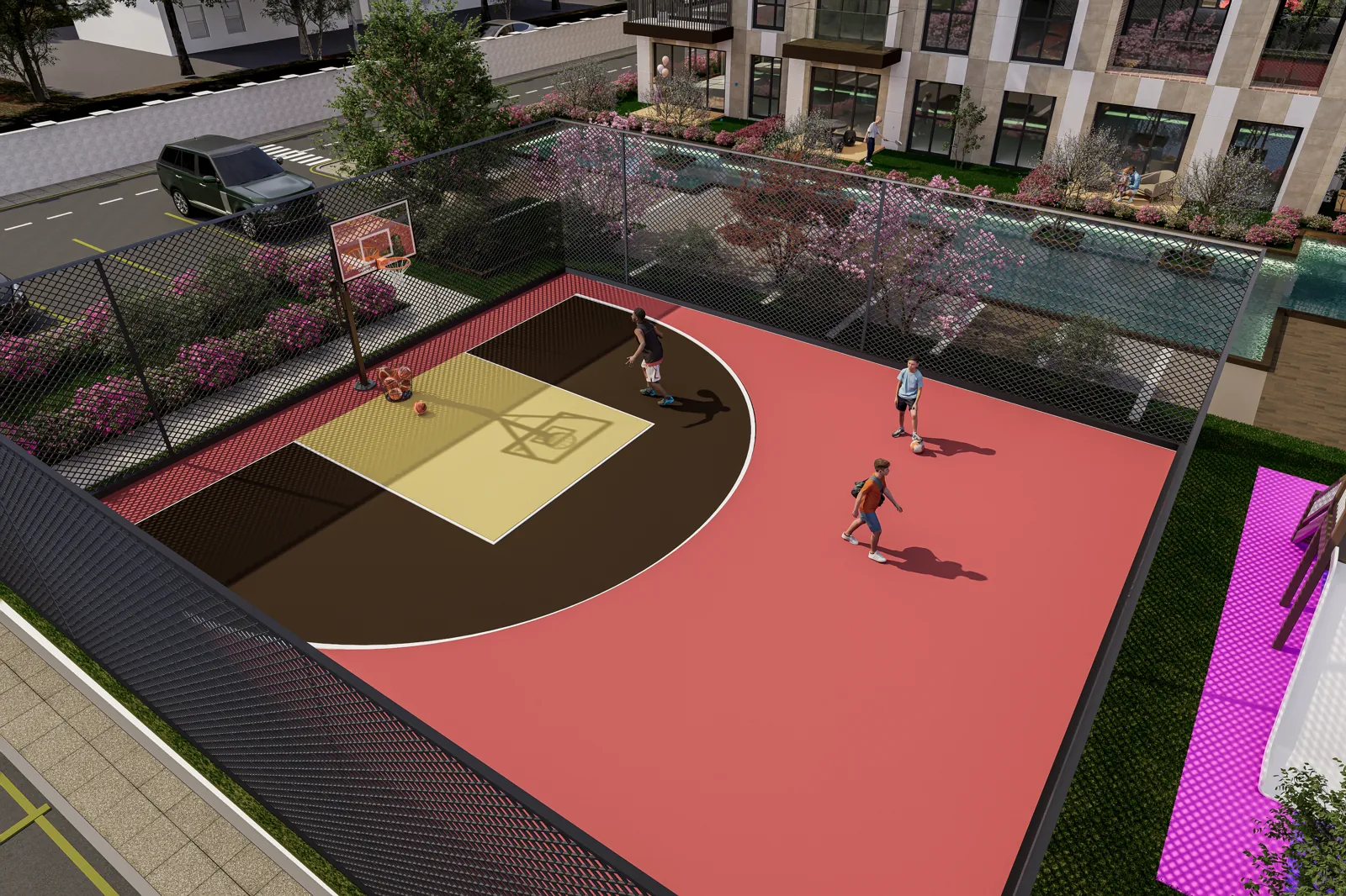 Basketbol sahası, ferah konumu ve peyzajla bütünleşen yapısıyla projeye hareket ve canlılık katıyor. Açık havada spor yapmanın özgürlüğünü sunarken, sosyal etkileşimi destekleyen dinamik bir buluşma noktası oluşturuyor.